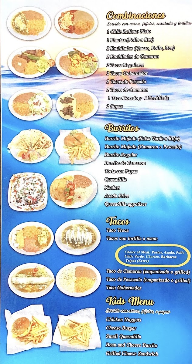 For those looking for a lighter option or a quick bite, the Ensaladas (Salads) are a great choice, with offerings like Ensalada de Camaron or the Taco Salad Pollo. The Tostadas section features mouthwatering choices, such as Tostada de Ceviche de Camaron and Tostada Mixta, offering a delicious mix of seafood and fresh toppings. If you're a fan of seafood, the Platillos de Mariscos menu is packed with tempting dishes like Camarones Rellenos or Camarones al Mojo de Ajo.